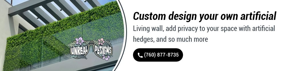 Unreal Designs, Inc. is an artificial greenery design company that specializes in custom faux living walls. From custom artificial living walls to artificial boxwood hedges to ficus mats to hedge rentals for events and more, there is something for anyone to explore. Unreal Designs currently serves clients in San Diego, Orange County, and Los Angeles but will soon expand to nationwide operations. Let Unreal Designs bring your greenery dreams to life with our expertise today. Call us today at 760.877.8735 to get started!